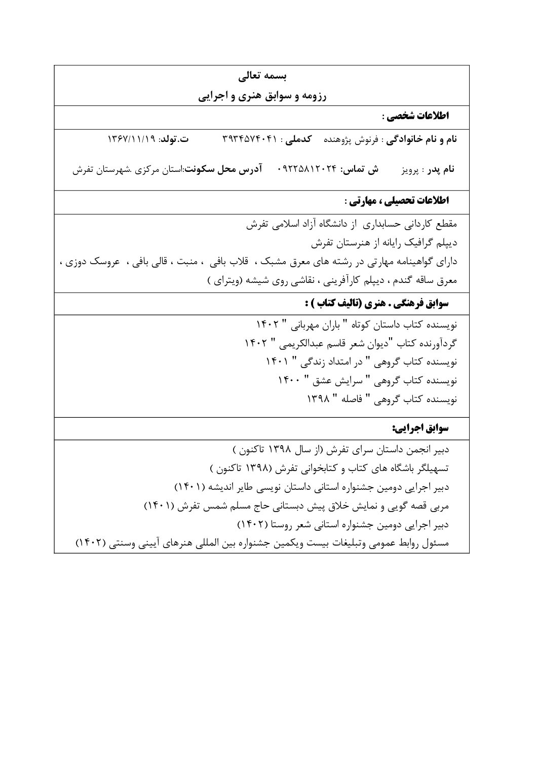نام :فرنوش نام خانوادگی:پژوهنده شماره شناسنامه